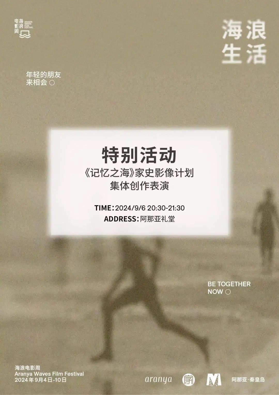 9月6日-9日,阿那亚家史影像计划的成果将作为特别活动,在海浪电影周期间呈现,包含十部家庭纪录片的展映及映后谈、家史主题沙龙对谈、身体剧场演出等,与大家一起探讨家与生命的羁绊。