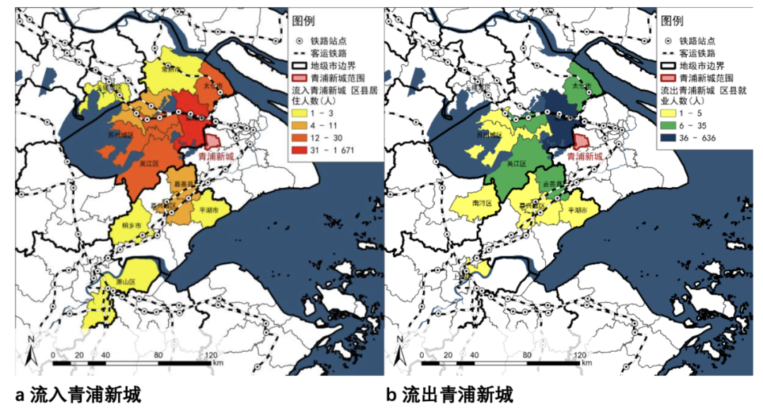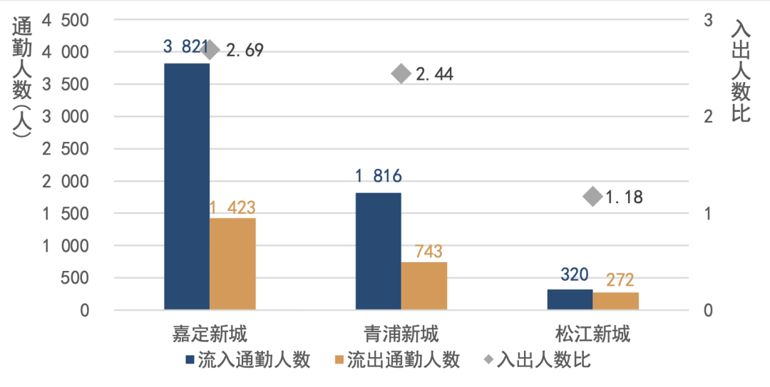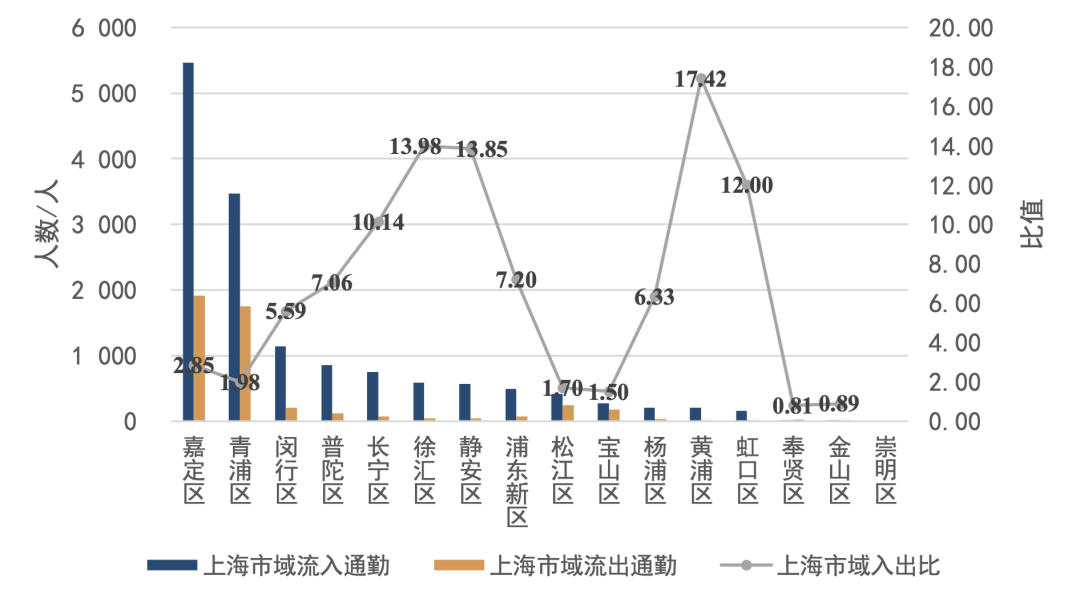 嘉定、青浦、松江三个临界新城与近沪地区跨城通勤联系紧密;流入、流出跨城通勤者均以相对短距离通勤为主;邻近市域边界地区的跨城就业双向吸引特征较为显著。