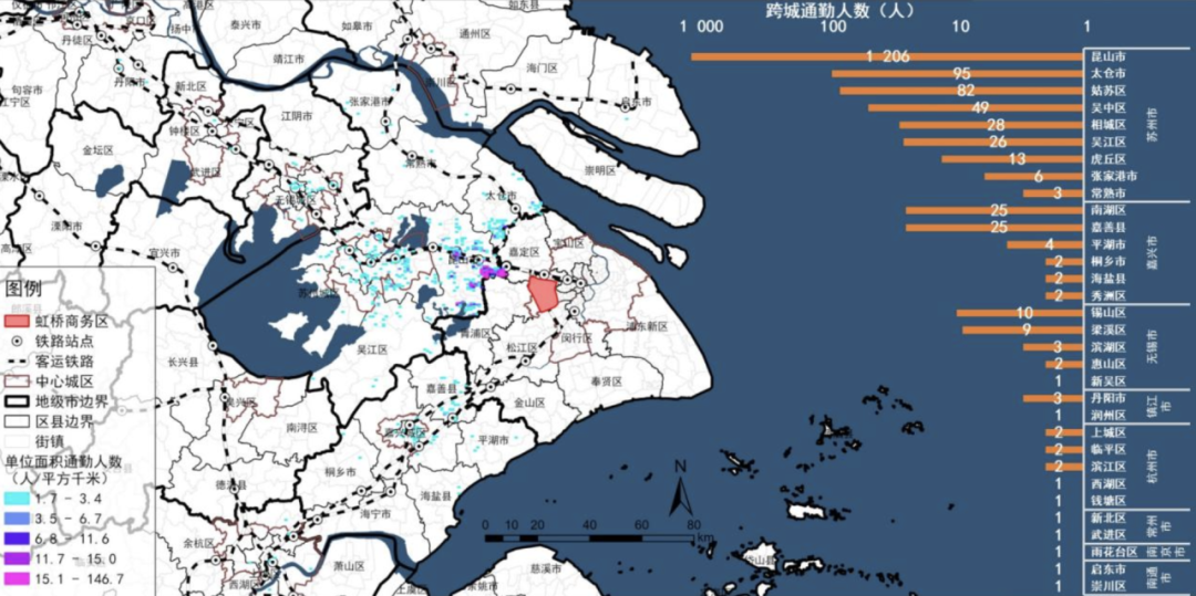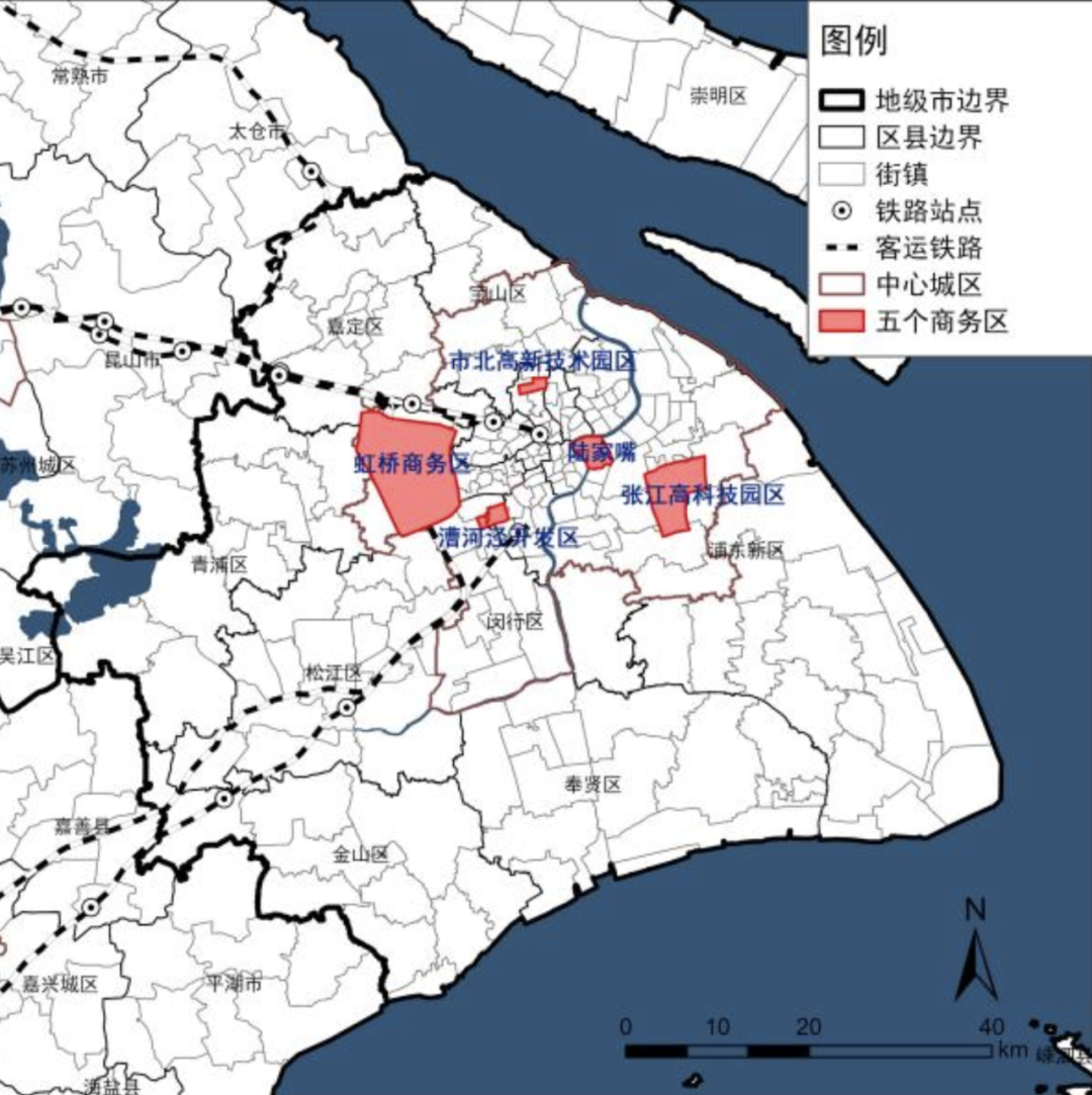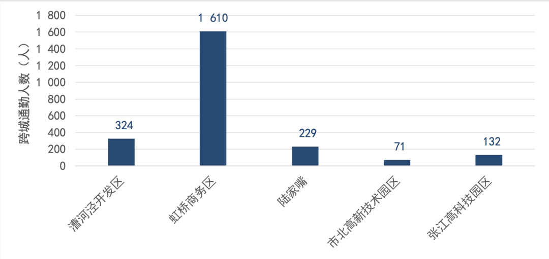 陆家嘴、漕河泾开发区、虹桥商务区、市北高新技术园区和张江高科技园区这五个典型商务区,不仅是上海就业岗位集中地,也代表了上海的全球资源配置、科技创新策源的城市职能。五个典型商务区的跨城通勤特征显示了上海核心城市职能与长三角城市关联。