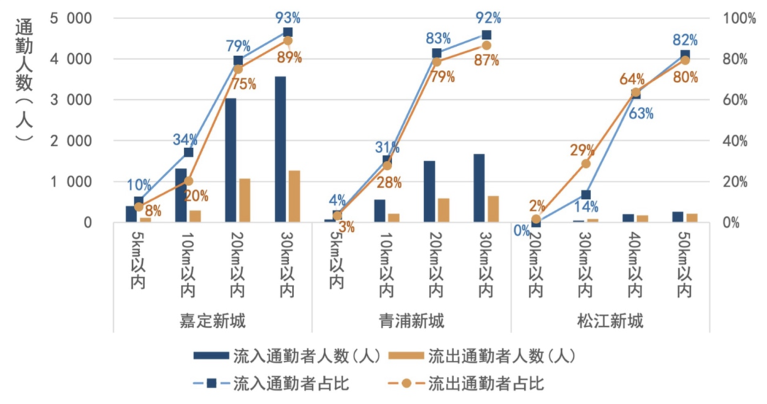 图3-3 三个新城流入通勤者、流出通勤者的通勤距离区间