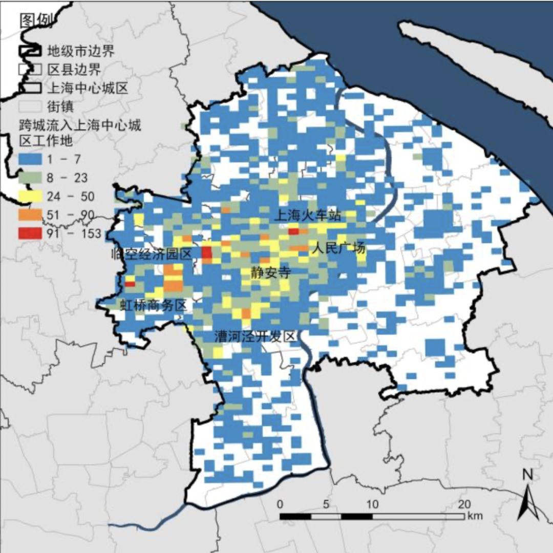 图1-2 跨城通勤者在上海中心城区的工作地热点区域分布
