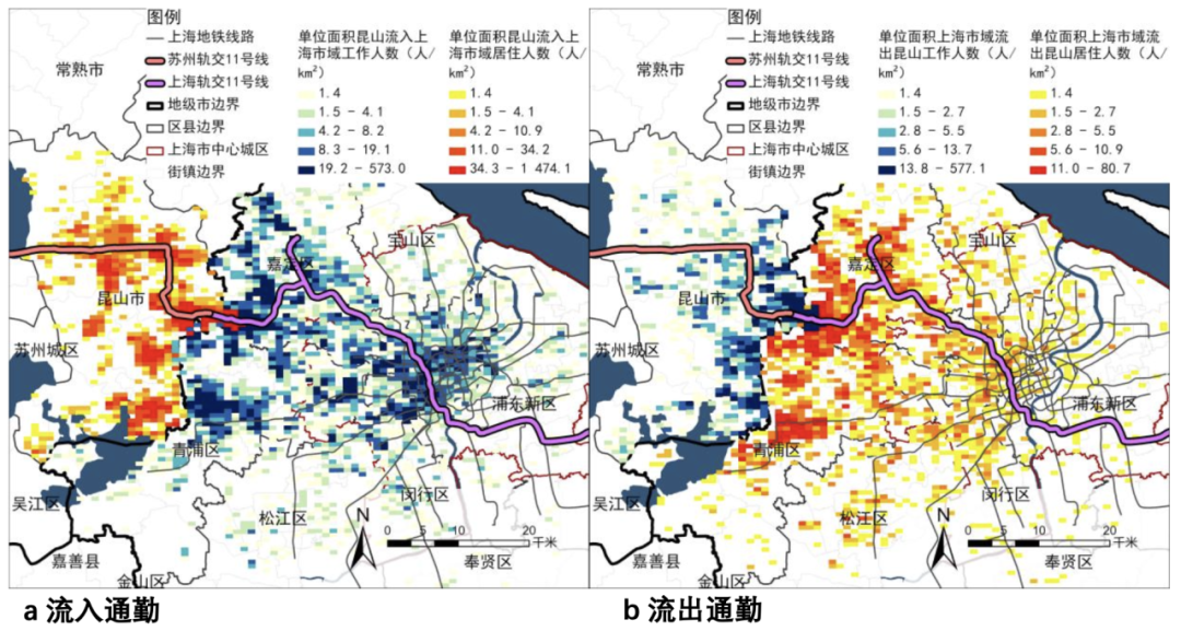 昆山市流入通勤的平均通勤距离为22.06公里,大于流出通勤平均通勤距离17.48公里,这也显示了上海市中心城区对昆山居民的就业吸引力。