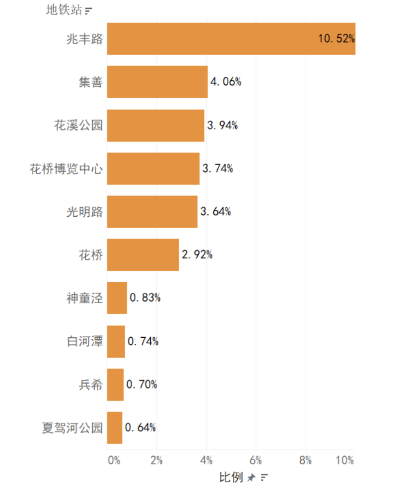 沪苏轨交11号线对接后的一年多以来,显著支撑了昆山来沪工作通勤。2024年沪苏11号线站点1公里覆盖范围内,昆山流入上海的跨城通勤者居住地占比最高的站点前四位分别是兆丰路站、集善站、花溪公园站、花桥博览中心站。其中,集善站、花溪公园站、花桥博览中心站三站是苏州11号线新开通站点,超过了原有11号线的光明路站、花桥站。
