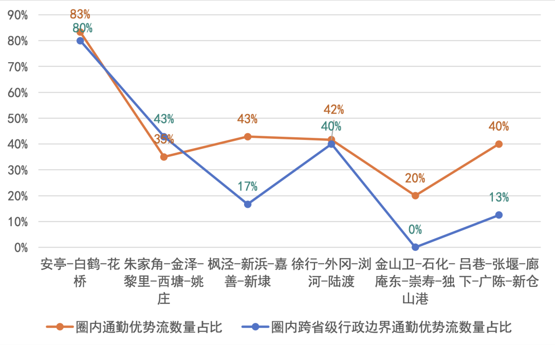 各城镇圈跨省级行政边界的优势流占比均较低。除安亭-白鹤-花桥外,跨界城镇圈在跨省通勤优势流数量上相对较少。安亭-白鹤-花桥和徐行-外冈-浏河-陆渡形成了较为紧密的跨省通勤网络,其余城镇圈跨省通勤网络则相对较弱。通勤联系的分布揭示了跨界城镇圈内的就业网络化程度。这表明省级行政边界表征的制度因素仍是影响跨界城镇圈就业融合的重要因素。