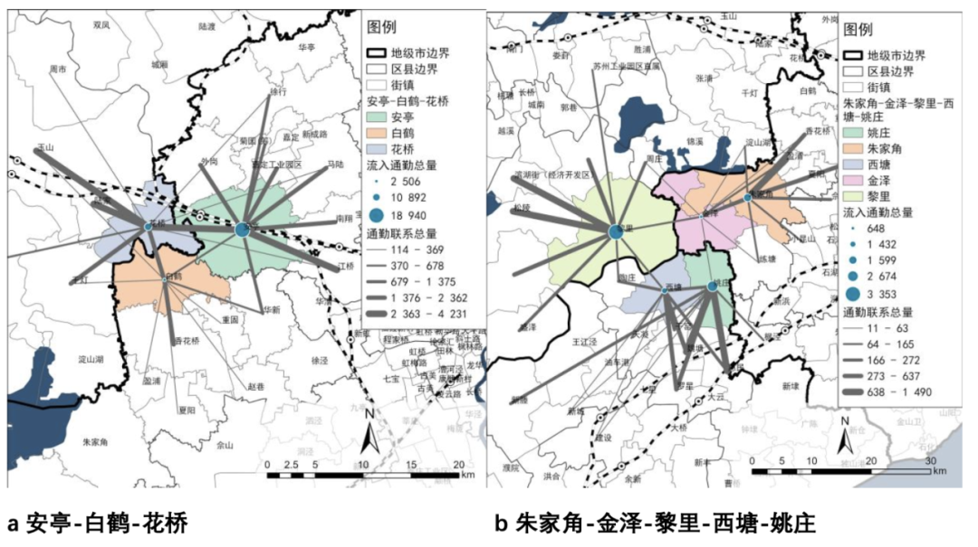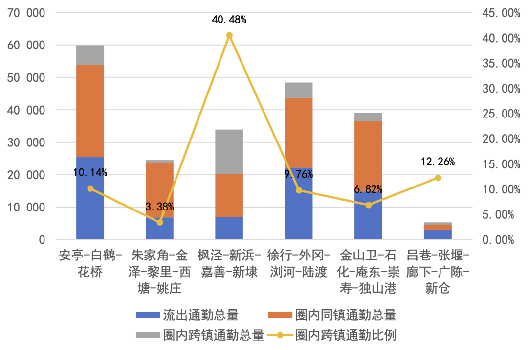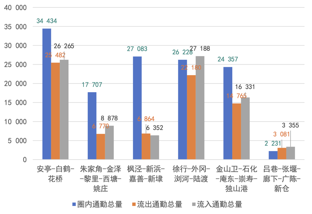 跨界城镇圈的通勤规模差异显著。安亭-白鹤-花桥在圈内通勤总量和流出通勤总量方面排名首位,徐行-外冈-浏河-陆渡的流入通勤人数最高。