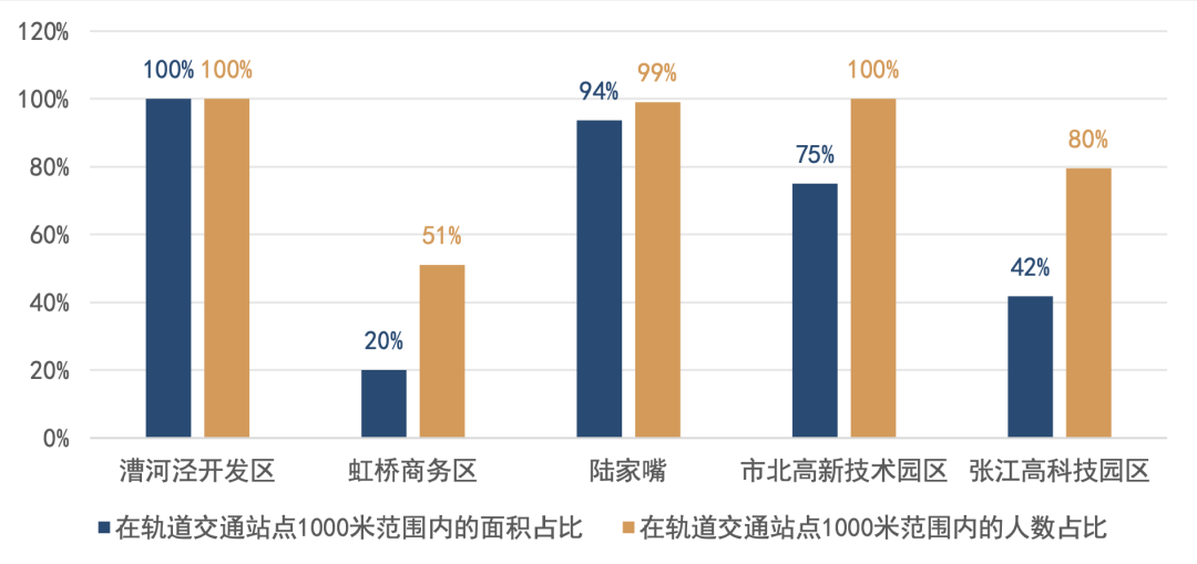 上海市内轨道交通对跨城通勤也起到了支撑作用,但不同商务区的依赖程度有所差异。漕河泾开发区、市北高新技术园区和陆家嘴的轨交站点覆盖率均接近100%,轨道交通是其跨城通勤的关键支撑方式。相比之下,虹桥商务区虽然轨交覆盖率仅为20%,但跨城通勤人数最多,表明它依赖多种交通方式。