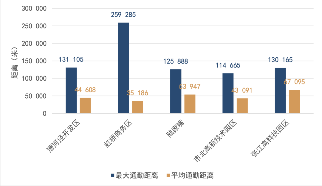 在跨城通勤直线距离上,通勤距离平均值体现了商务区的区位特征。张江高科技园区由于位于上海中心城区东部,与长三角近沪城市地理位置最远,因此平均通勤距离最长,达到67公里。虹桥商务区的平均通勤距离为35公里,相对最短,但是虹桥商务区的最大通勤距离值最大,达到259公里。虹桥商务区跨城通勤人数最多,居住地来源范围最广、最大通勤距离值最高,这些均显示了上海核心商务职能与区域综合交通枢纽组合带来的结果。