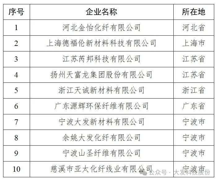 近日,工业和信息化部公示了符合《循环再利用化学纤维(涤纶)行业规范条件》企业名单(第二批),此次共有 10 家企业入选,宁波大发新材料有限公司、余姚大发化纤有限公司双双上榜。此次成功入围行业规范名单,无疑是对大发在循环再利用涤纶纤维的研发深度、生产精度、管理细度等多方面的高度认可。
