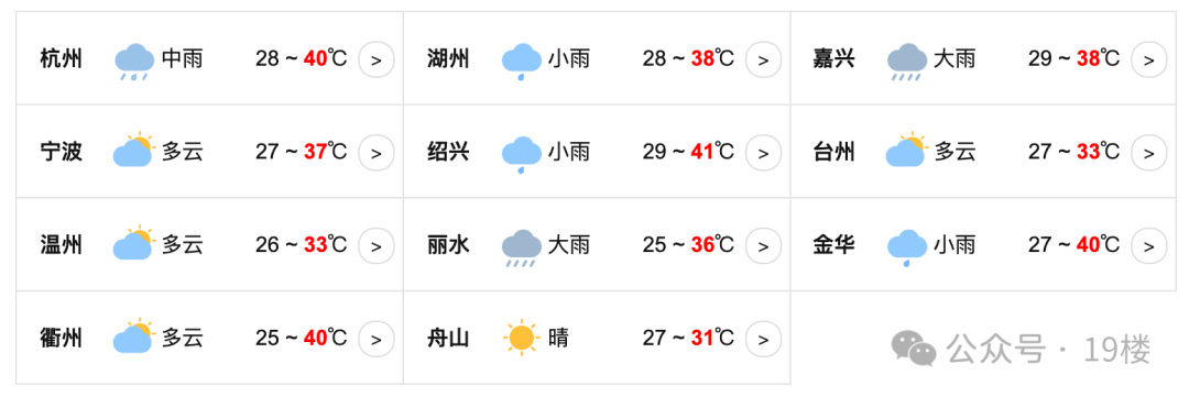 杭州今日中雨,最高气温40度。
