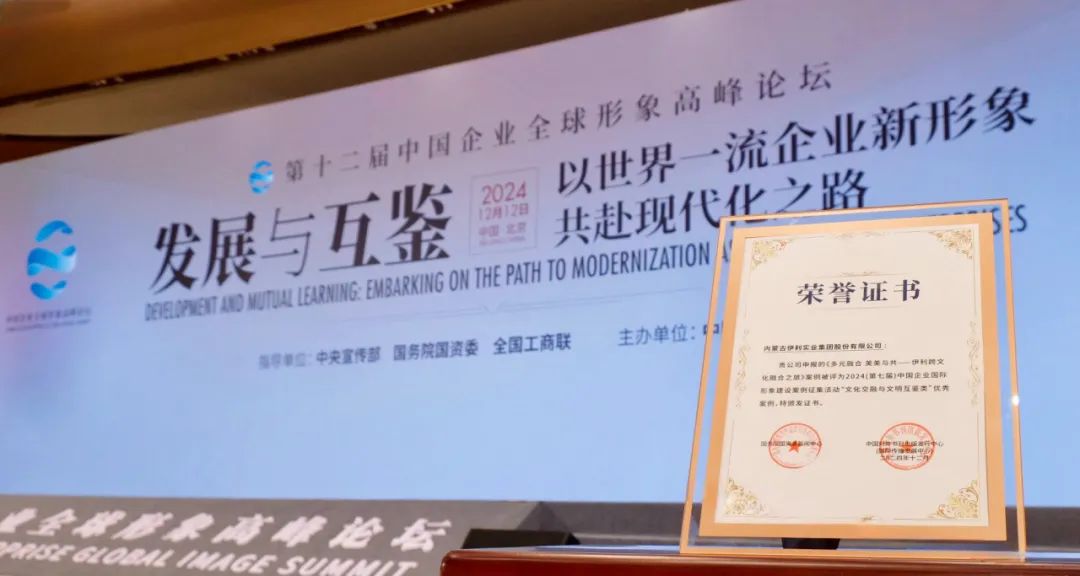 12月12日,由中央宣传部、国务院国资委和全国工商联指导,中国外文局主办的第十二届中国企业全球形象高峰论坛在北京举办。论坛期间,“第七届中国企业国际形象建设案例征集”评选结果揭晓,伊利集团凭借其卓越的全球化战略与国际形象塑造实践,荣获优秀案例奖,成为乳制品行业中唯一获此殊荣的企业。伊利国际化优秀实践被纳入《2024年度中国企业国际形象建设案例集》,将面向全国公开出版发行,不断提升优秀案例“示范效应”。