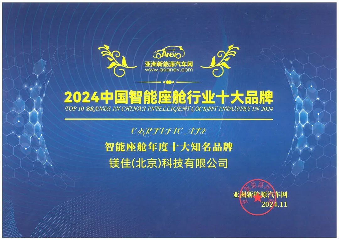 本次会议由亚洲新能源汽车网、智能座舱产业联盟联合举办,邀请了多位行业专家深度探讨智能座舱的最新技术与趋势,精准捕捉智能化时代下车载显示产业链上下游的广阔发展机遇,为参会企业探索创新商业模式与经济增长新路径提供宝贵启示。会上同期对国内具有广泛行业影响力的智能座舱供应链头部企业发起评选活动,表彰在智能座舱领域取得卓越成就的企业。镁佳科技凭借优秀的产品实力和市场影响力斩获“2024中国智能座舱行业十大品牌”。