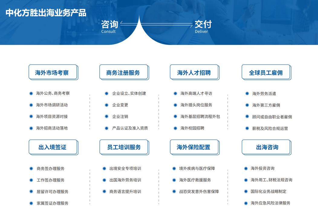 中化方胜是目前国内领先的面向全国能源化工垂直领域提供人力资源综合管理服务的专业化公司,出海产品覆盖海外市场考察、商务注册服务、海外人才招聘、全球员工雇佣、出入境签订等八大场景。