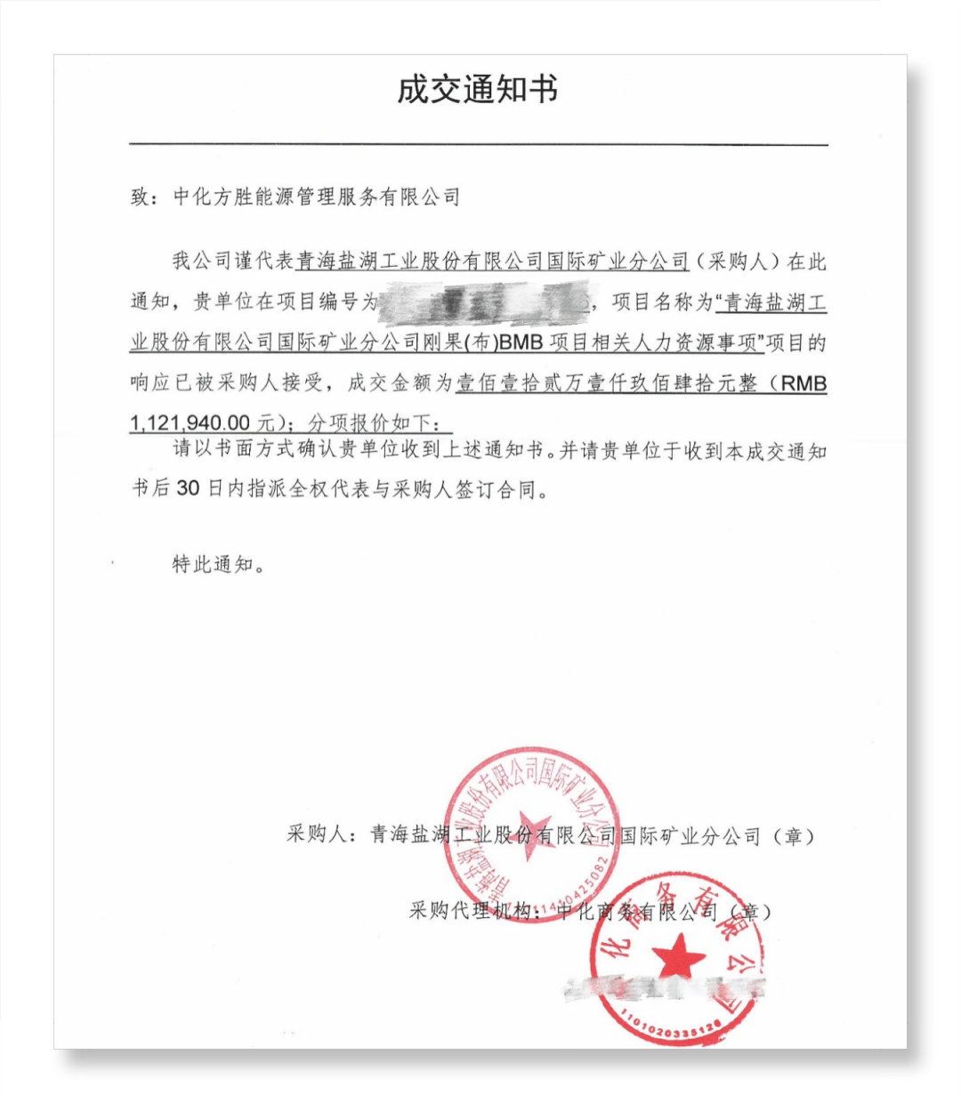 近期,中化方胜能源管理服务有限公司(以下简称“中化方胜”)成功中标青海盐湖工业股份有限公司国际矿业分公司刚果(布)BMB人力资源事项采购项目(以下简称盐湖股份BMB项目),项目标的金额112.194万元。