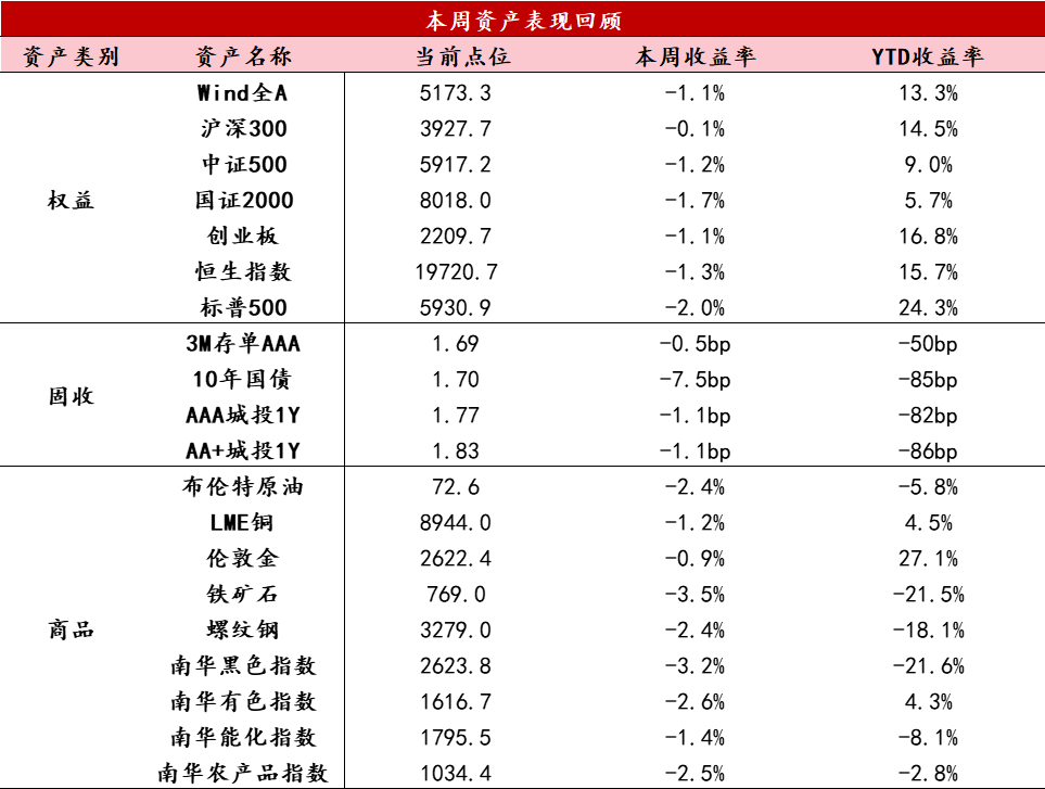 【商品】本周黑色商品价格下跌,螺纹表需延续淡季超预期的表现,春节对齐后表需好于去年水平,终端建材成交平稳,产量基本走平,总库存呈现快速去化状态、库存绝对水平处于低位,政策逐渐进入空窗期。本周伦敦金价格下跌,本周美联储议息会议如期降息25bp,但点阵图和鲍威尔讲好偏向鹰派,对明年降息的空间下调,带动美债收益率和美元指数走高,黄金价格大幅回落,后两个交易日收复部分失地,全周来看小幅下跌。