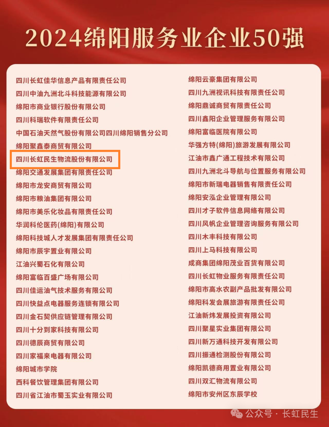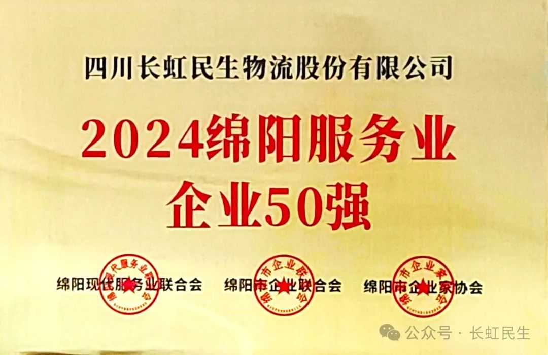 在绵阳市服务业企业中,长虹民生荣获“2024绵阳服务业企业50强” 。