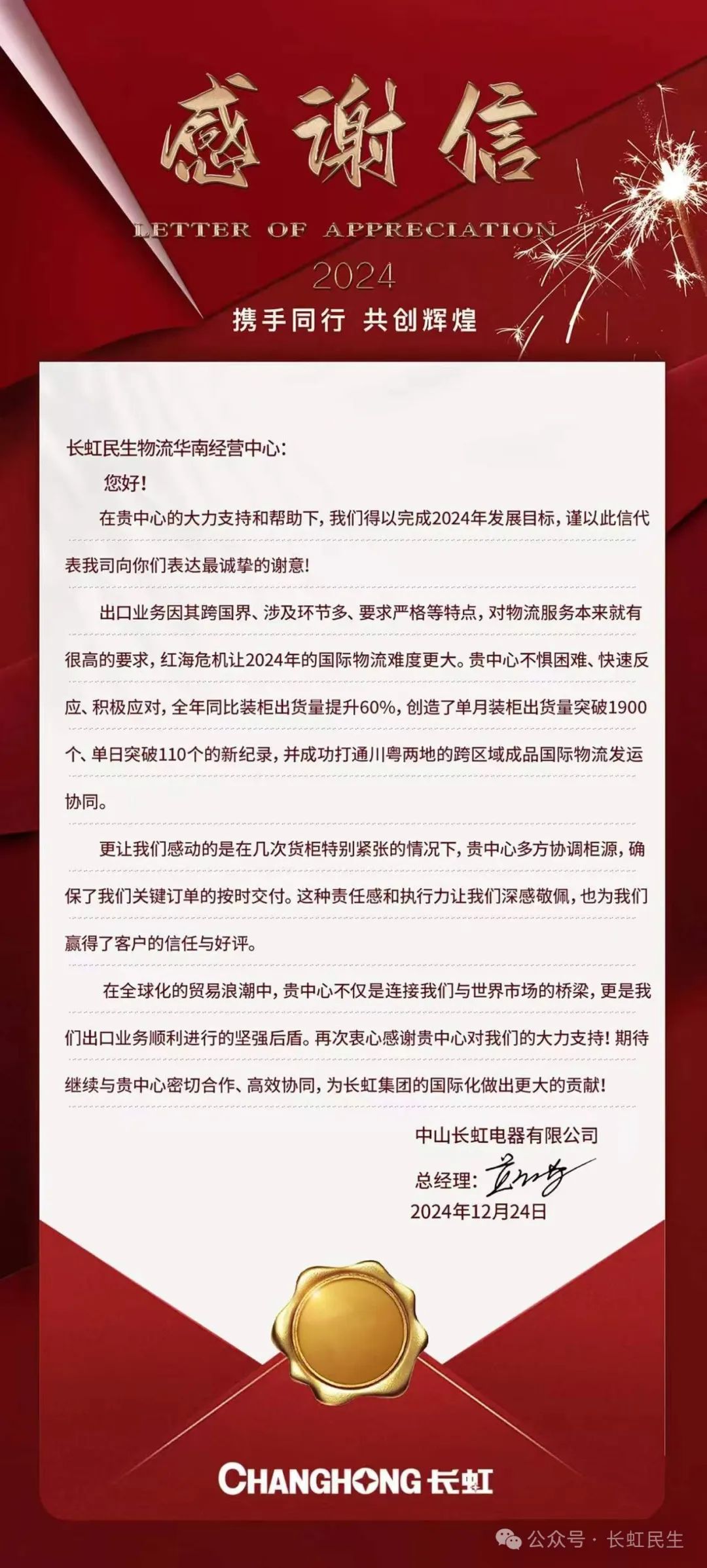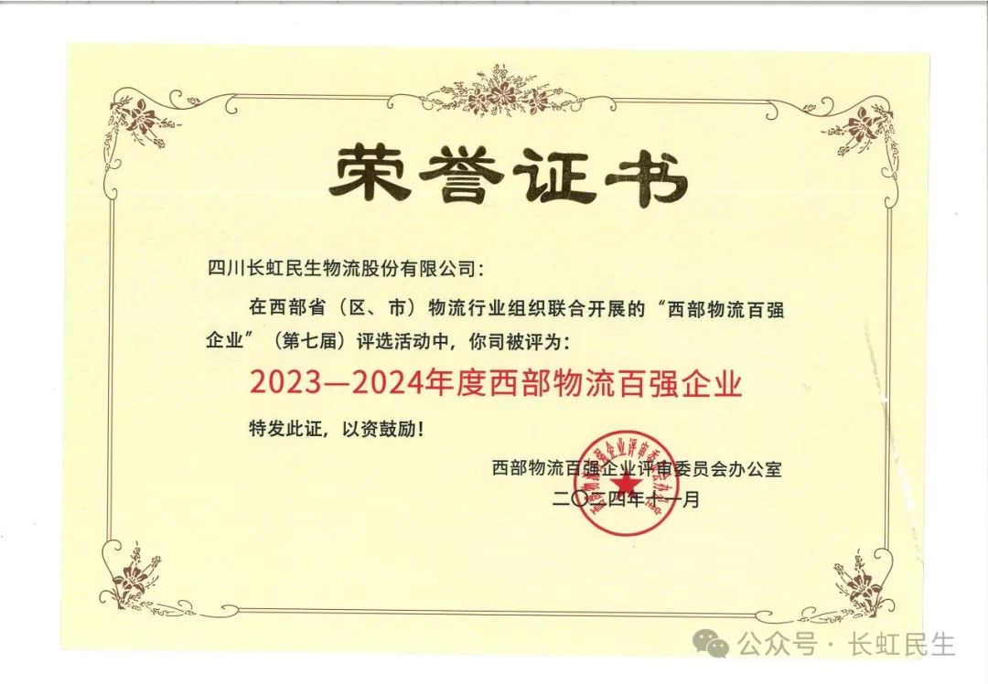 2024年的这些荣誉,是长虹民生不断发展、砥砺前行的见证。未来,长虹民生将继续秉持卓越的服务理念,不断提升自身实力,在物流行业创造更多的辉煌。