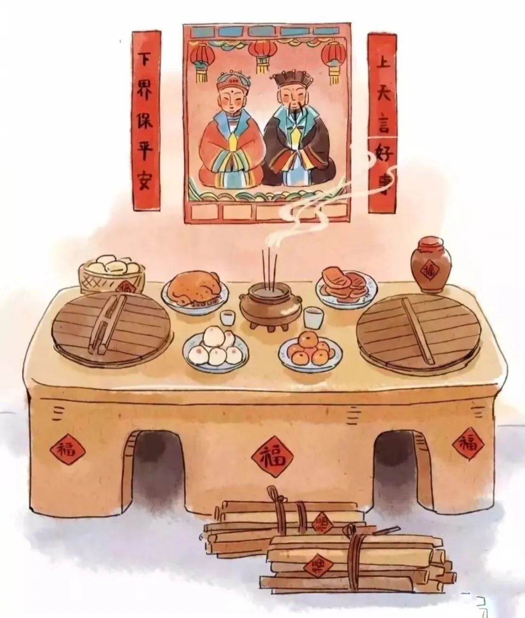 在中国传统习俗中,小年是民间祭灶的日子,传说灶王爷这一天要上天向玉皇大帝汇报一家人的善恶,人们在灶台上摆上糖瓜等祭品,希望灶王爷吃了之后能在玉帝面前美言几句,“上天言好事,回宫降吉祥”。