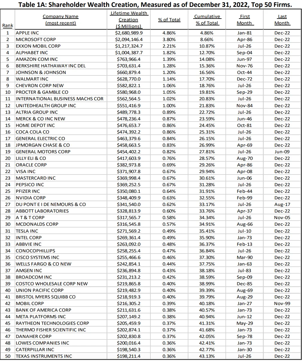 如果只看美股的数据,从1926年到2022年,创造财富最多的3家公司(苹果、微软和埃克森美孚)创造了10.87%的净财富,前10家企业创造了19.81%的净财富,前50家企业创造了43.13%的净财富,而58.6%的个股会让股东财富减少。
