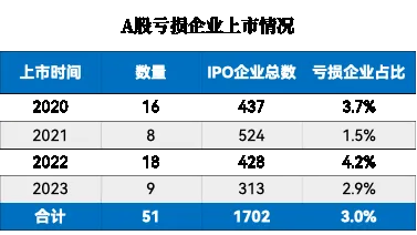 再看A股,2020—2023年,共有1702家企业于A股IPO,其中亏损企业仅为51家,占比3%。