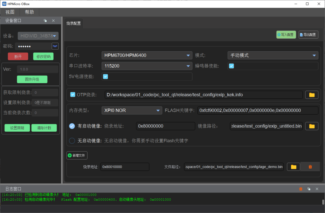 HPM OBox Tool 是 HPMicro 公司推出的用于配置HPM OBOX离线烧录器的上位机工具,旨在帮助用户快速地对HPM OBOX离线烧录器进行配置和更新。该工具支持HPM OBOX离线烧录器密码鉴权连接、密码修改、设置限制烧录次数、模式配置、OTP烧录配置、镜像配置等功能。同时支持写入配置、导出配置。详细功能及使用方法请下载工具查看帮助文档。