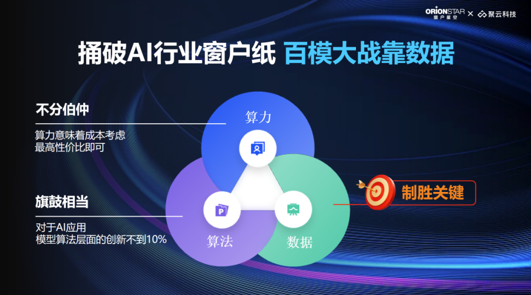 猎户星空首席科学家韩堃介绍道,近年来,由于计算能力的提升、大规模数据集的可用性以及算法的改进,AI大模型进入爆发增长期,算力、算法、数据,是大模型发展的关键三要素。然而,相比于算法和算力,在大模型商业闭环中,数据明显成为最直接影响其在垂直行业落地效果的关键。