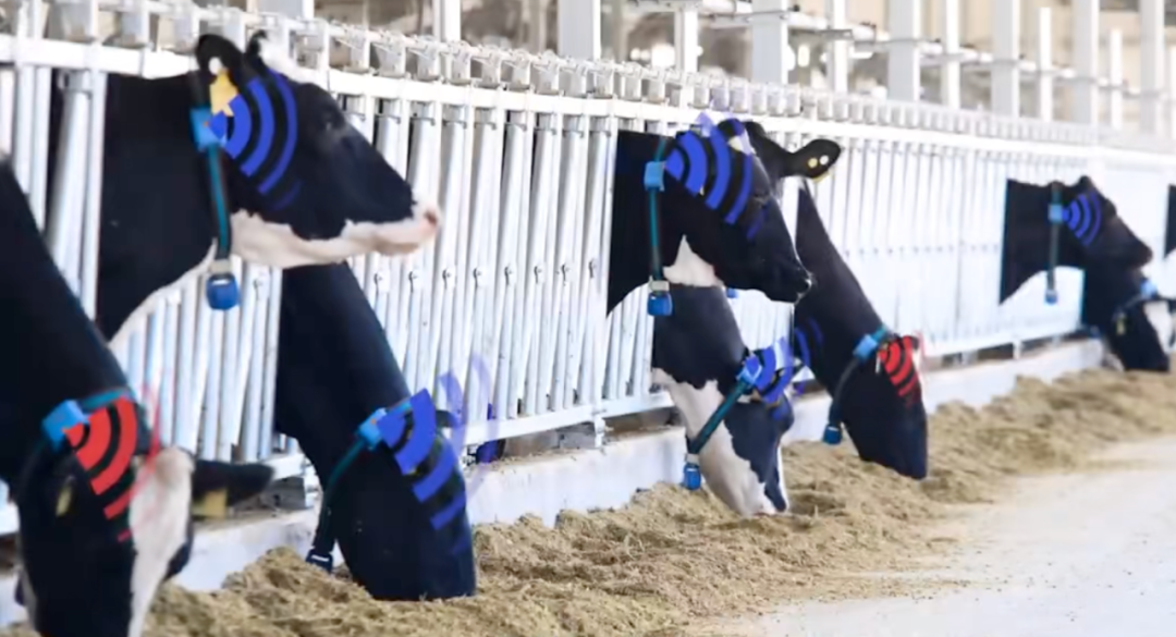 在我们的“牧场家”,牛牛们都佩戴上了智能项圈设备,工作人员能利用AI技术对奶牛每天的采食、发情、反刍、躺卧数据进行分析,实现疾病及时揭发和准确获得奶牛最佳配种时间。牛舍里还安装了AI精准喷淋设备,节水效率达40%左右。