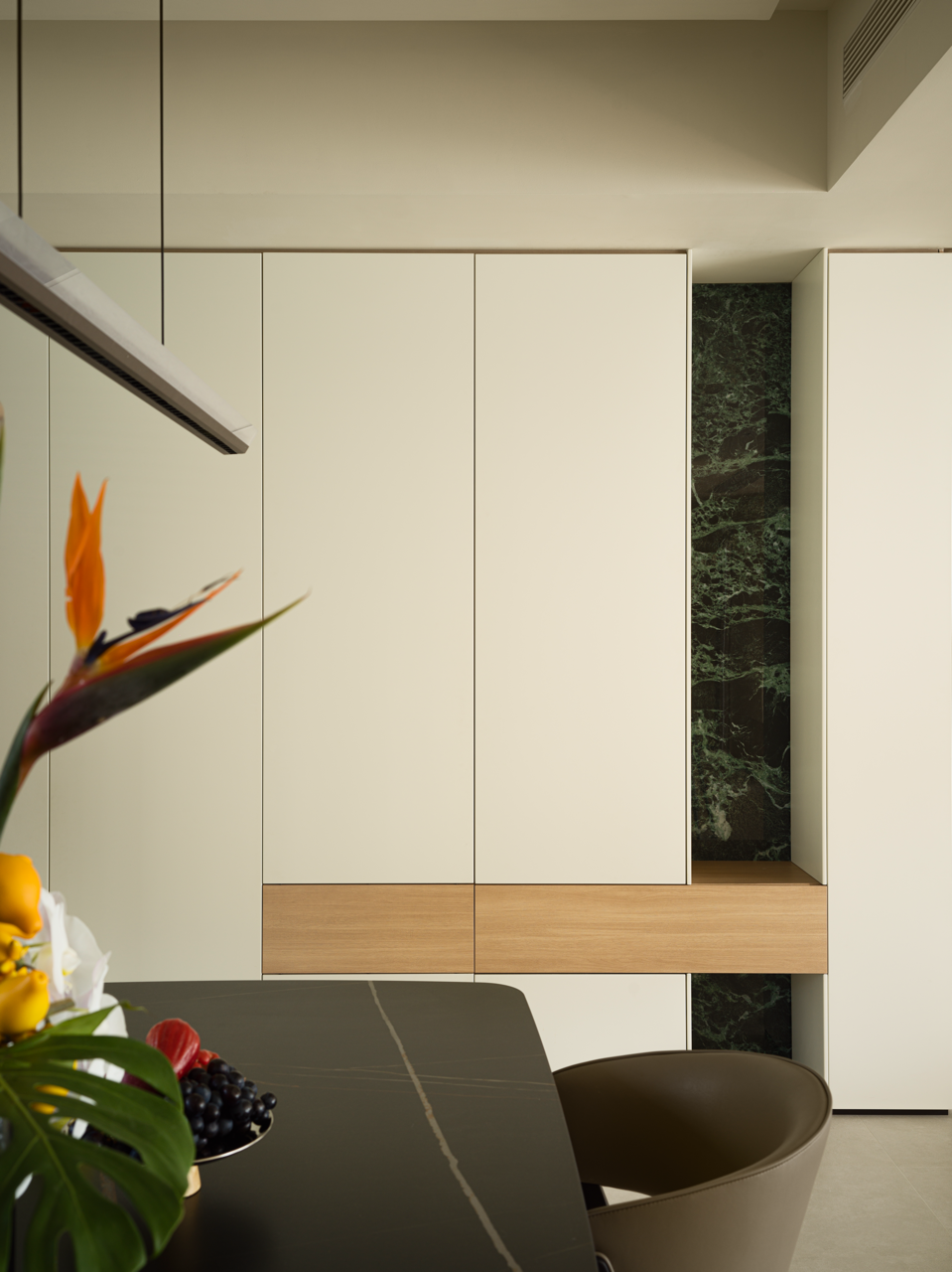 餐边柜则选用了白色作为主色调,顶天立地的柜体,辅以错层的木色柜体,和纵向内嵌的墨色岩板,像一整面给人踏实感的白墙,但又充满设计细节。