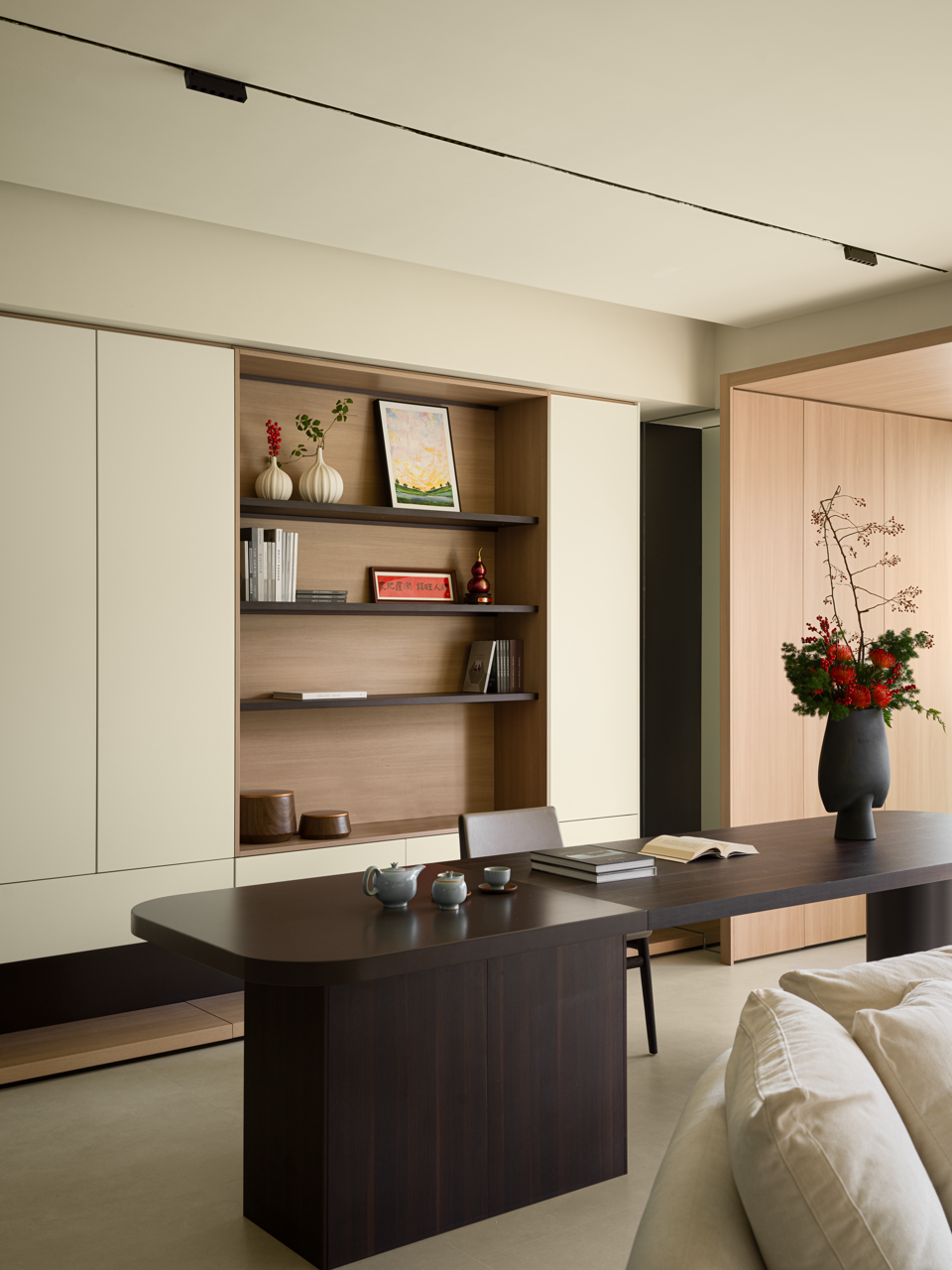 考虑到小石榴正处于充满好奇与活力的成长阶段,在完全解放了客厅的活动空间后,陶先生决定在客厅后方区域,设计社交属性更强的茶室。