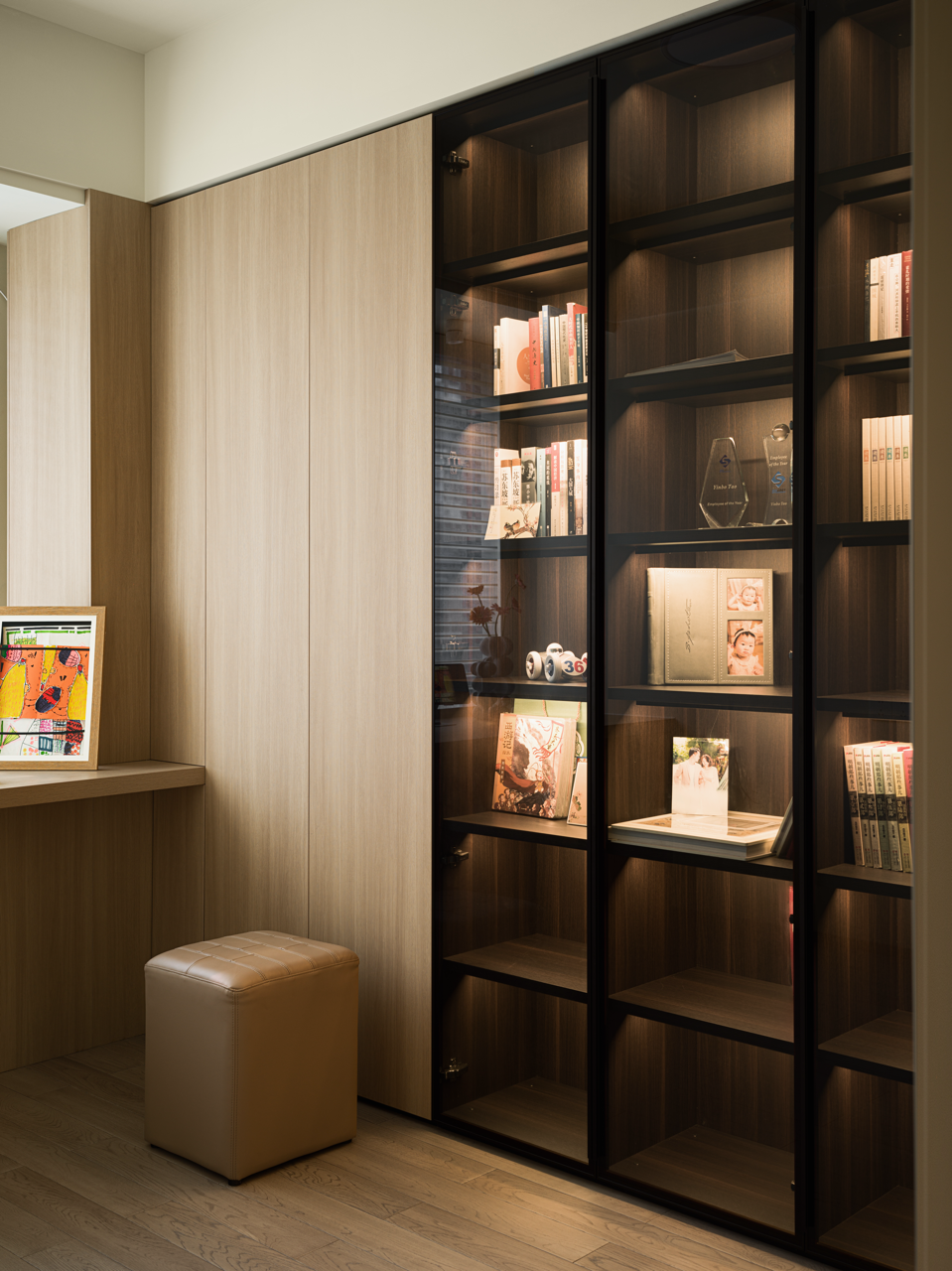 常阅读的书籍、荣誉奖杯、照片,被井然有序地安置在橱窗内,在富有质感的打光下,倍显温馨感。