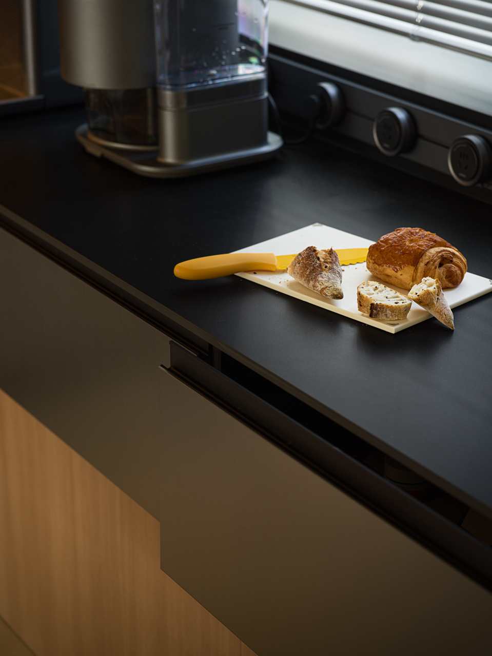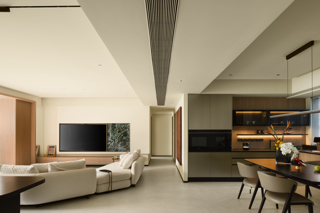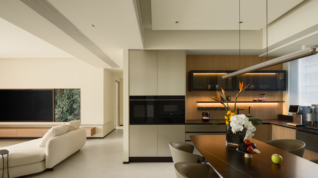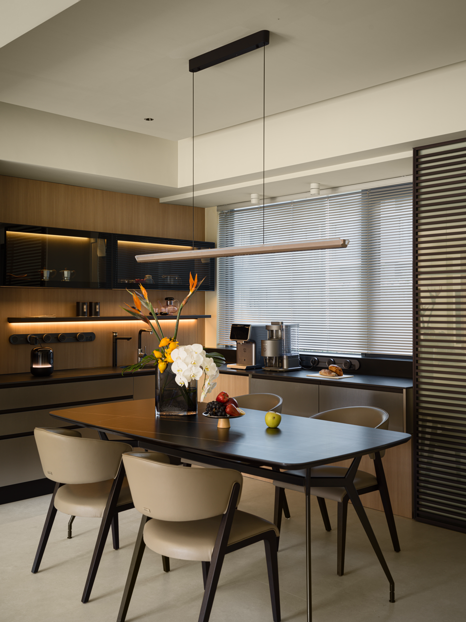 厨柜的设计同样沿用了黑白及木色系,搁架上设计了金色的柔光灯带,让餐厅自带舒缓视觉。