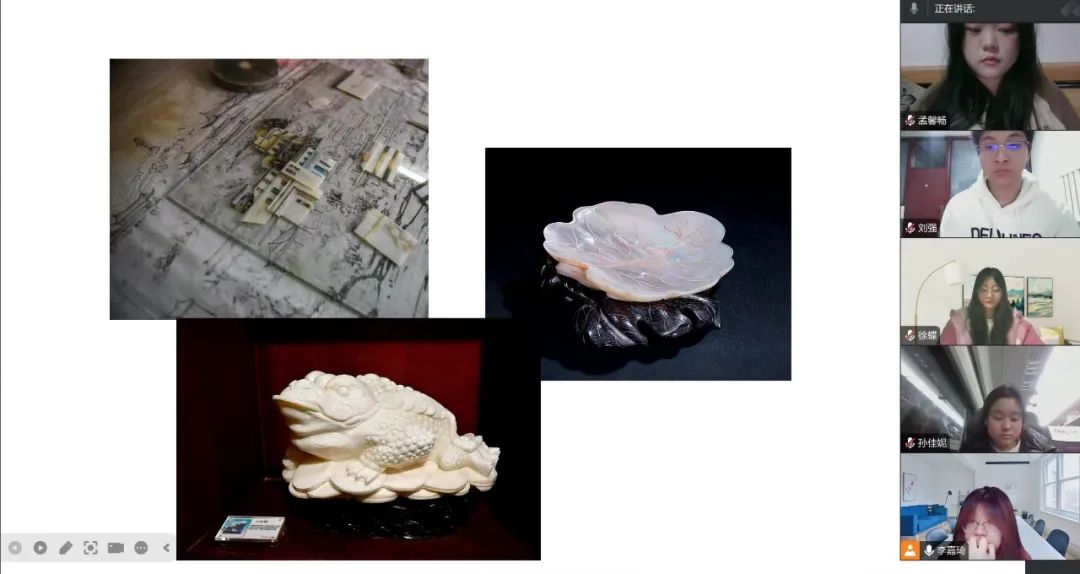 分享开始,李佳睿同学向我们介绍了北海贝雕的由来。它始于唐代,兴盛于明清。在古代,贝壳因其美观与稀有,常被用作装饰品和货币。随着工艺的发展,贝雕逐渐成为宫廷和贵族喜爱的艺术形式,其精湛的技艺和独特的审美价值得到了广泛的认可。每一个阶段的变化,都承载着历史文化的变迁。