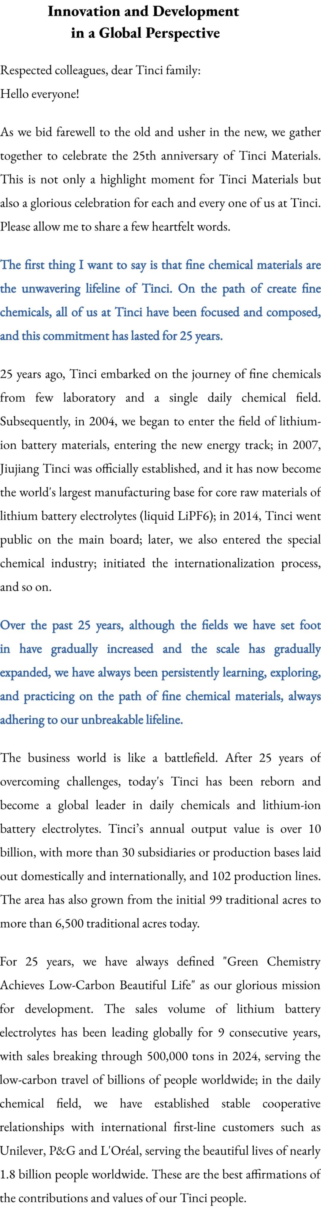 25年来,我们始终把“绿色化学成就低碳美丽生活”定为我们发展的光荣使命锂电池电解液销量已连续9年全球领先,2024年销售突破50万吨,服务全球亿万人低碳出行;日化方面与联合利华、宝洁、欧莱雅等国际一线客户建立稳定合作关系,服务了全球近18亿人的美丽生活。这些就是对我们天赐人贡献与价值的最好肯定。
