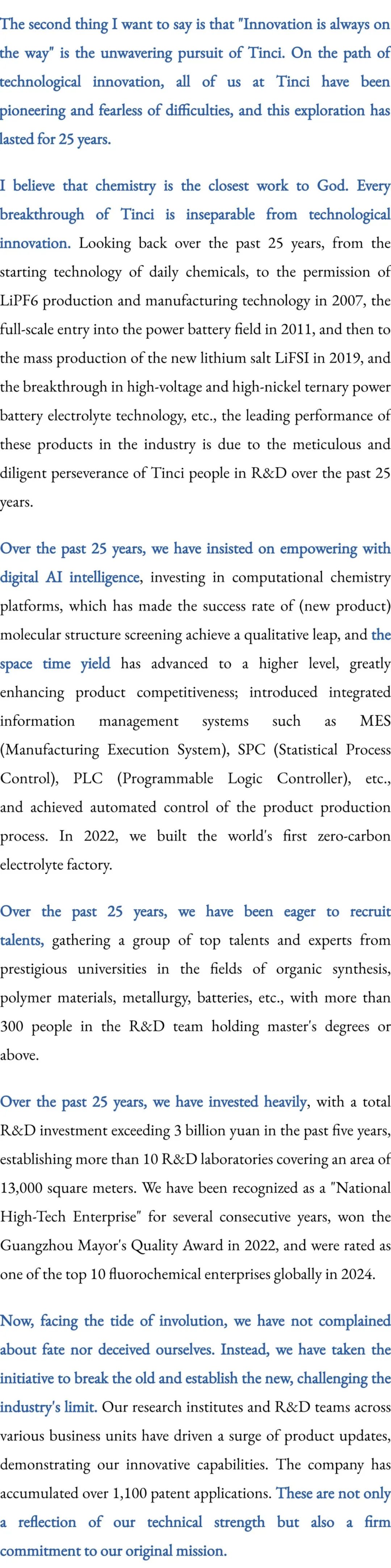 我想讲的第二句心里话是:“创新永远在路上”是天赐坚定不移的追求。在科技创新的道路上,全体天赐人敢为人先,不惧艰难,这一闯就是25年。