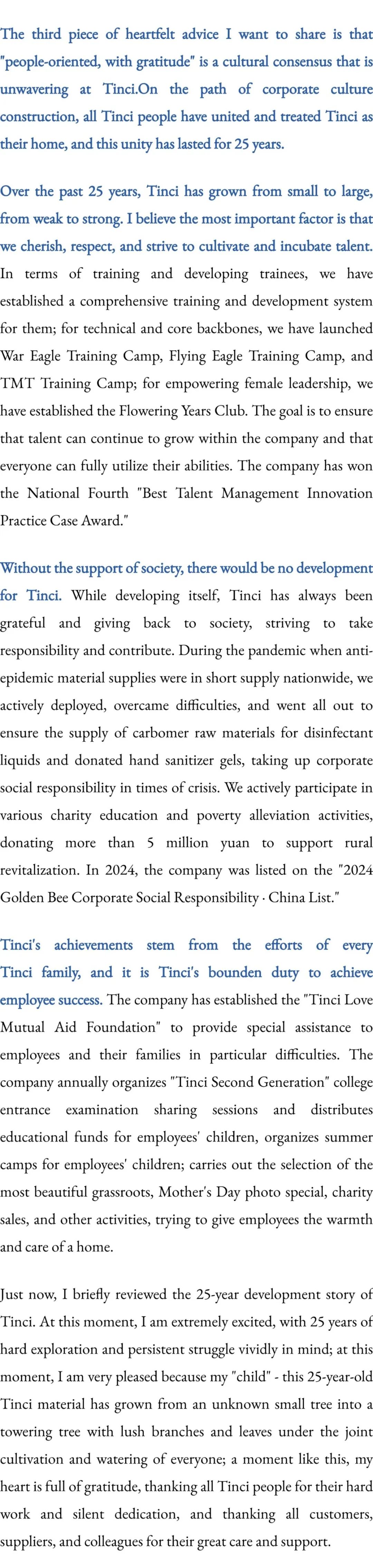 我想讲的第三句心里话是:“以人为本,心怀感恩”是天赐坚定不移的文化共识,在企业文化建设的道路上,全体天赐人心合力聚,以企为家,这一聚就是25年。