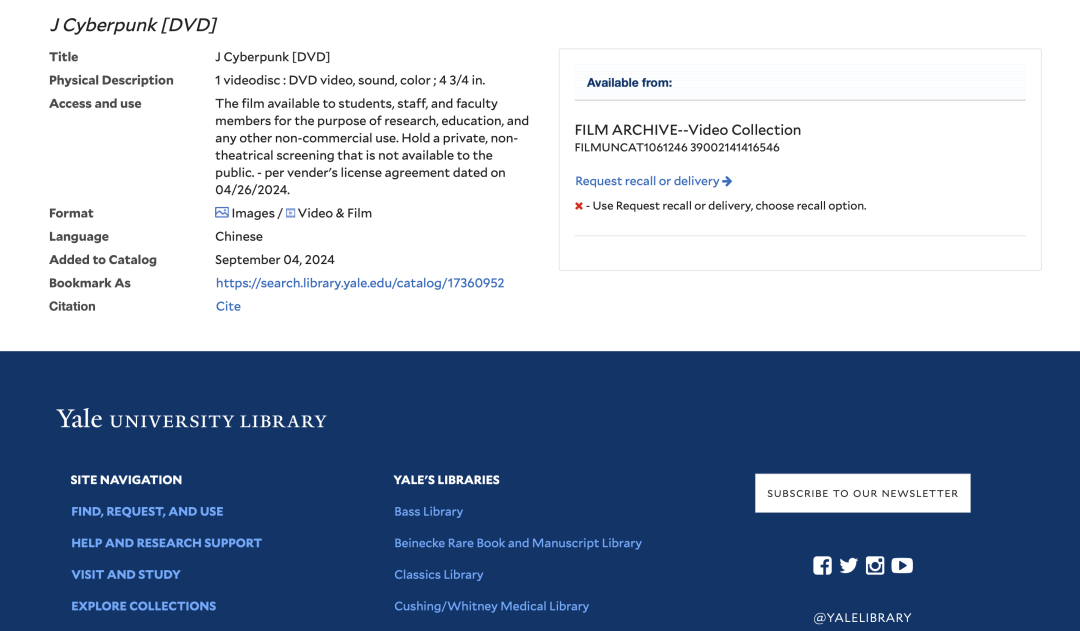 九月份,很高兴得知,我的两部短片被美国耶鲁大学购买收藏了。