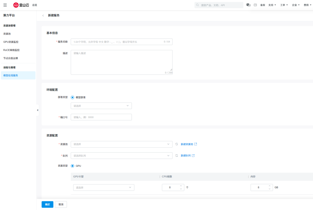 注:当前部署在线服务需用户预先进行资源池创建并保证资源池内有可用GPU资源,用户可以通过关联KCE(金山云容器服务)集群实现资源池创建。