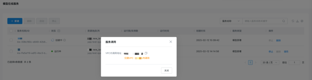 3. 点击确认,确认后平台进入模型部署环节,等待服务状态变为运行中后即可对模型进行调用使用