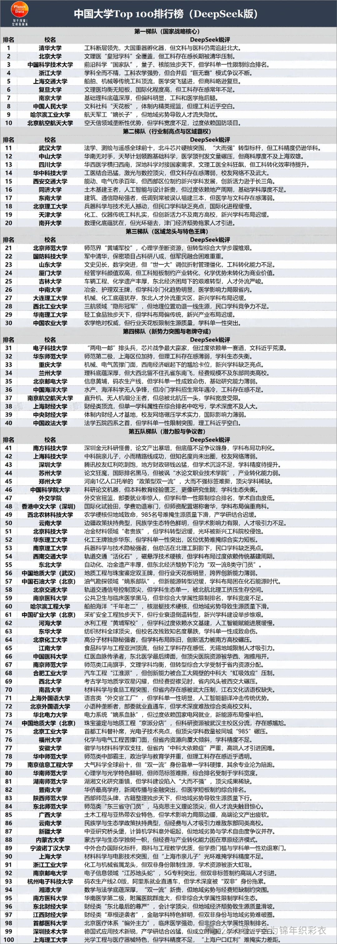 DeepSeek回应了它认为的中国大学TOP100排行榜,并把这100个学校分成了5个梯队: