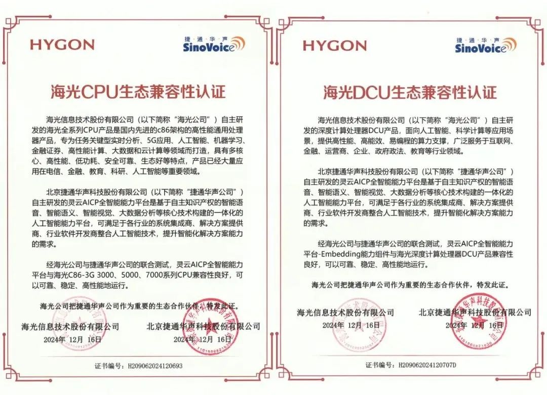 近日,捷通华声自主研发的灵云AICP全智能能力平台顺利完成与海光信息技术股份有限公司(以下简称“海光”)CPU处理器与DCU系列加速卡的生态兼容性认证,并获得双重认证证书。