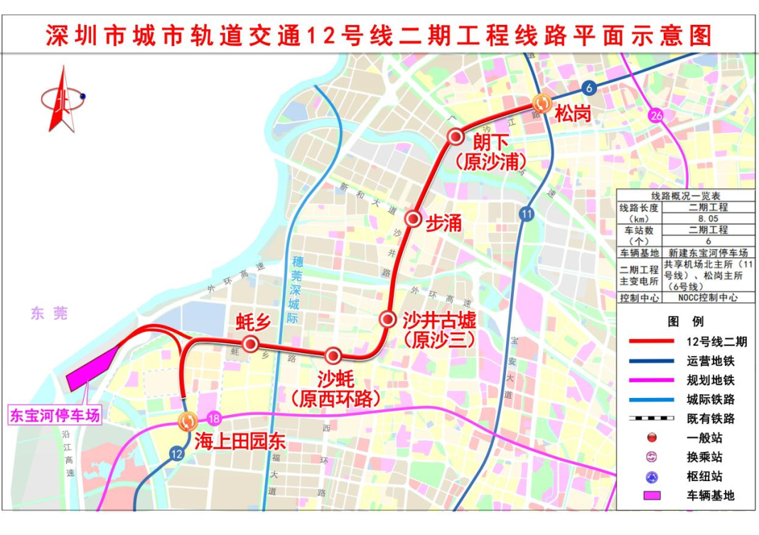 深圳地铁12号线二期工程(北延)位于深圳市宝安区,由一期工程终点海上田园东站引出,终至松岗站,线路全长约 8.05km,共设车站 6座。作为连接沙井、松岗等主要工业区的重要线路,12号线二期的开通将有助于缓解沿线区域的交通压力,提升市民出行幸福感,加强宝安区与南山区等中心城区的经济联系。