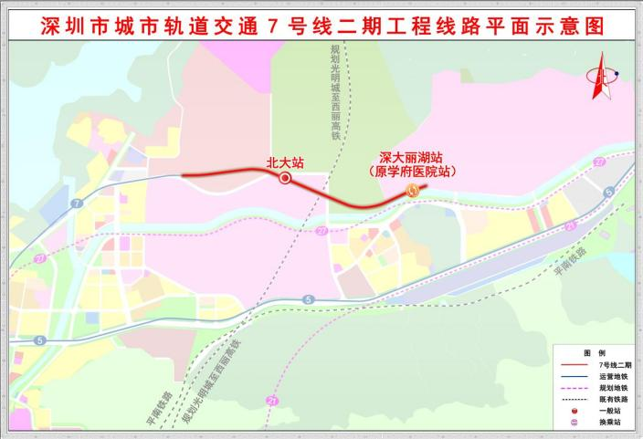 深圳地铁7号线二期(东延)线路由7号线一期工程终点西丽湖站引出,终至深大丽湖站。线路全长约2.28 km,设站2座。7号线二期开通将有效提升深大总医院等南山片区交通出行效率。全长2.2公里的“智慧连廊”将教育、医疗和绿色生活无缝衔接,为深港合作区与西丽湖国际科教城的沟通搭建了更为顺畅的桥梁。