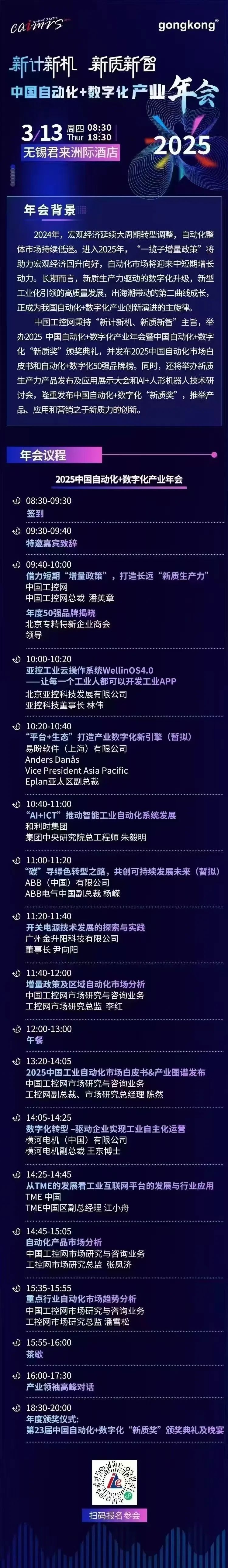 3月13日,由中国工控网主办,中国信息通信研究院工业安全中心、北京专精特新企业商会、中国机电一体化技术应用协会支持的2025 CAIMRS即将震撼来袭。本届大会以“新计新机 新质新智“。在这里,不同行业的思想将激烈碰撞,老牌企业携成熟工艺与市场洞察,新兴力量带奇思妙想与果敢锐气,专家学者捧前沿理论与技术突破,企业领袖握战略眼光与布局谋略。他们将以高屋建瓴之姿探讨产业发展新路径,以前瞻布局之谋擘画未来蓝图,为行业持续繁荣注入磅礴动力。