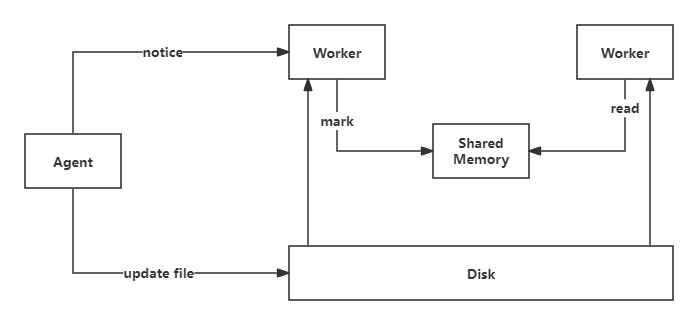 具体来说,Nginx是一个多进程的应用,会存在多个worker进程处理请求,进程间天然存在内存隔离。在worker的生命周期里,在每个worker初始化时先加载数据到内存,运行时动态同步更新内存数据。为了把更新推送到每个worker进程,我们基于Nginx Lua提供的共享内存功能,在共享内存中缓存每个数据模型的最新版本,而worker进程通过一个timer来不断轮询共享内存,发现版本有更新后从磁盘读取数据模型,加载到内存,对于每个场景可以在Lua中自定义具体的数据加载逻辑。