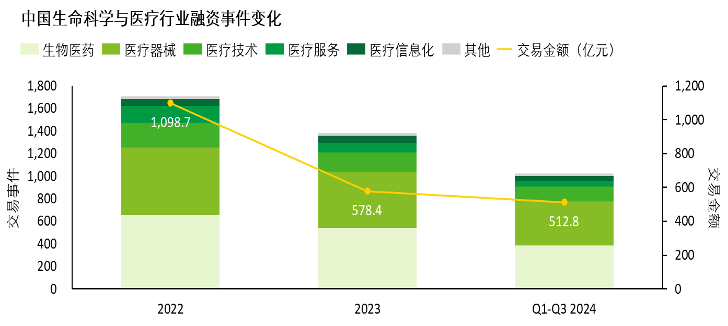 受政策环境和成功出海的刺激,资本市场在2024年下半年初步回暖。受国家政策以及中国药械企业的成功出海的刺激,中国生命科学与医疗资本市场在2024年初步回暖,前三季度总融资交易金额已接近2023年全年金额。生物医药和医疗器械在2024年仍是主要投资赛道,但在交易数量和融资规模皆同比有所下降,轮次也向金额较小的早期轮次转移。整体呈现“投硬、投小”的趋势。