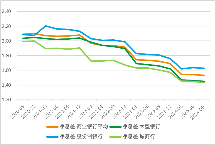 2024年三季度末,商业银行息差1.53%,降幅趋缓。2025年降息的紧迫性和幅度有所缓和,银行息差收窄幅度也会小于2024年,预计全年降幅在10bp内。