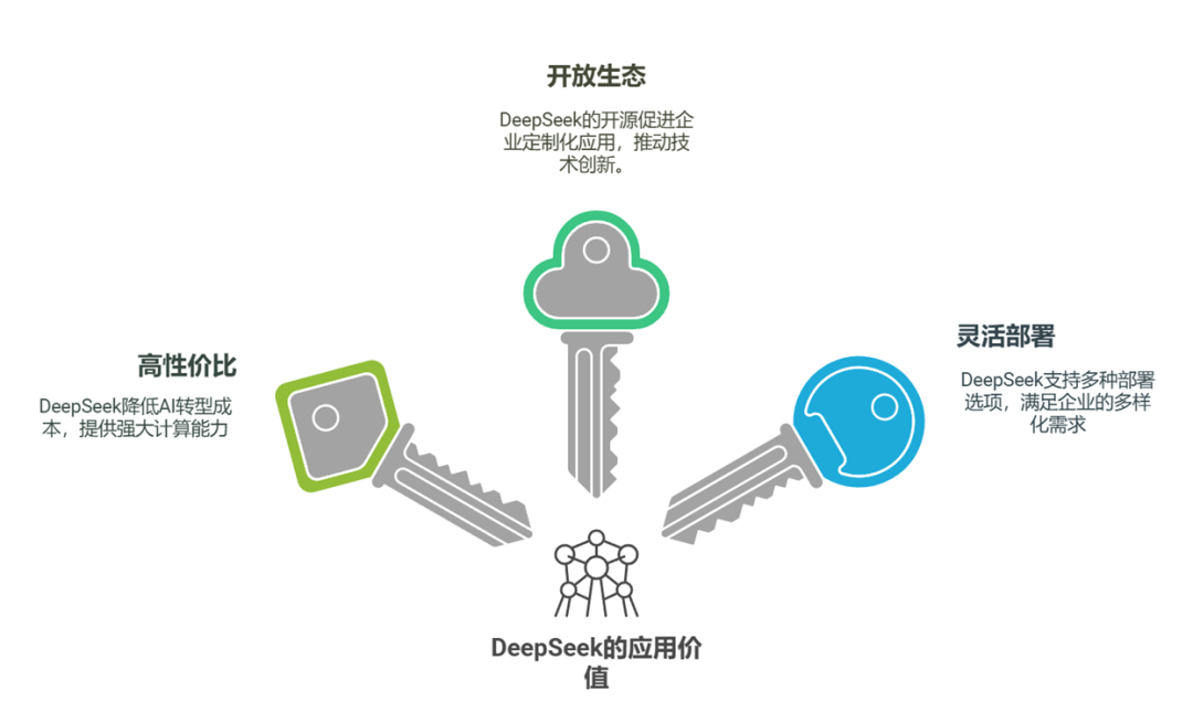DeepSeek突破了传统大模型的应用壁垒,形成了多层次的部署方案。大型企业倾向采用私有化部署方案,深度利用DeepSeek的开源特性进行场景定制;中小企业则借助API快速接入模式,实现高性价比的业务创新。