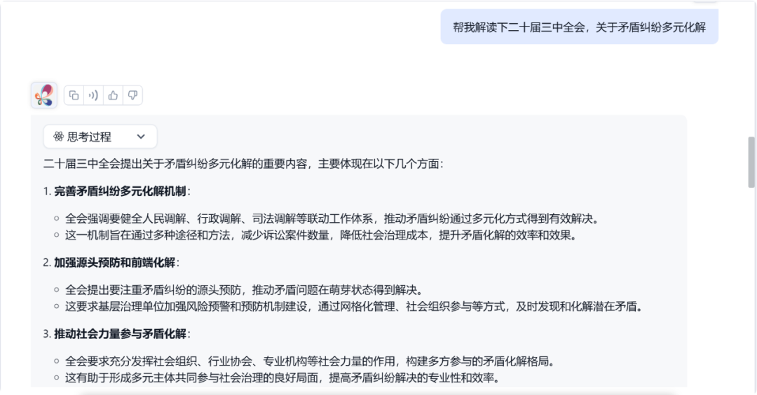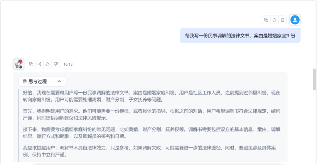 面对复杂多样的调解场景与案情,系统依托强大的数据分析与语言推理能力,整合政法海量数据,借助AI技术构建精准决策模型,深度剖析核心诉求与案件关键要点,进而给出科学合理的决策建议,为政法工作提供有力的智慧支撑 。